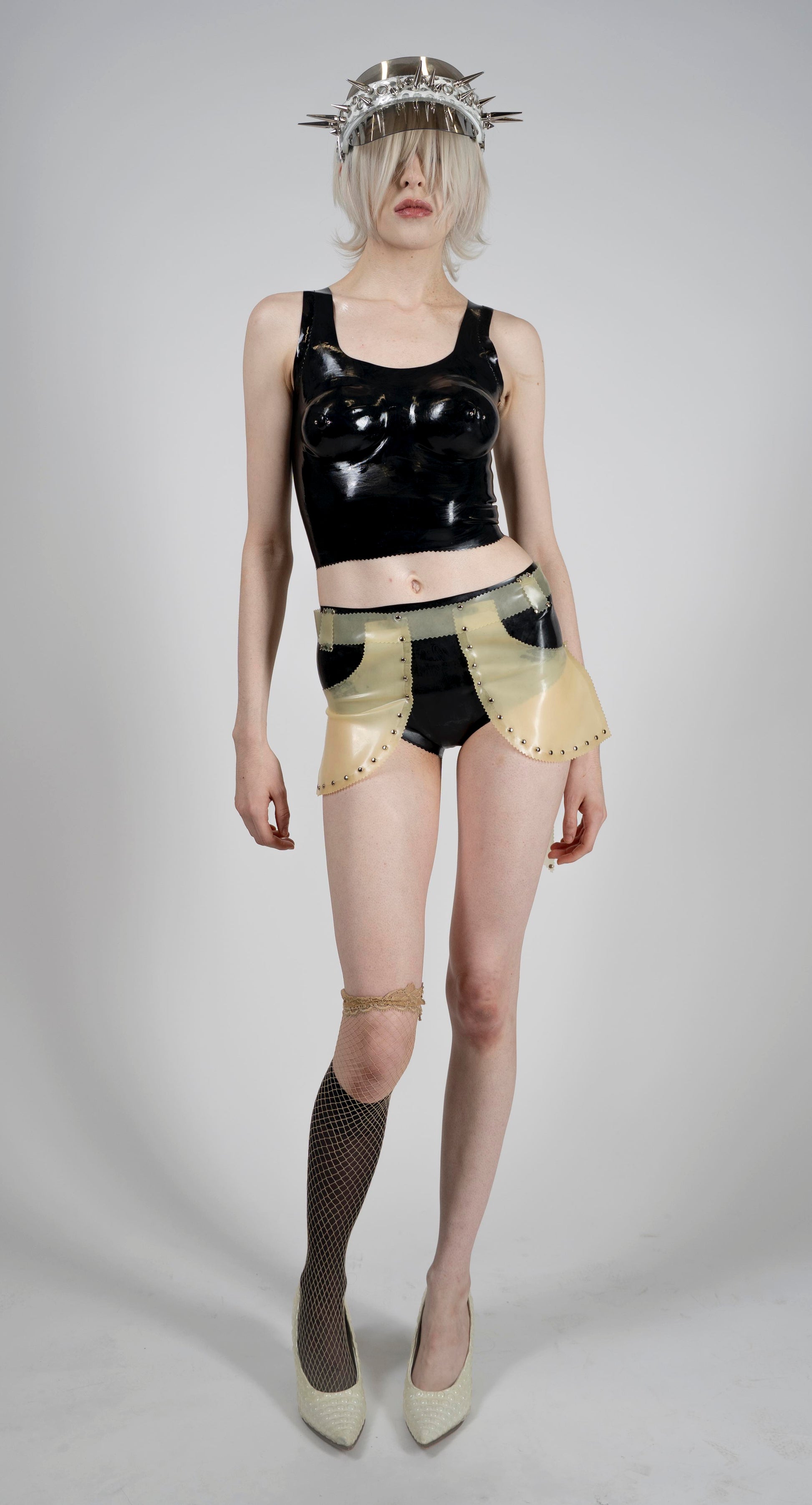 Cargo Set B — Top Ver: Pierced Body Frame Top paired with Latex Cargo Shorts.