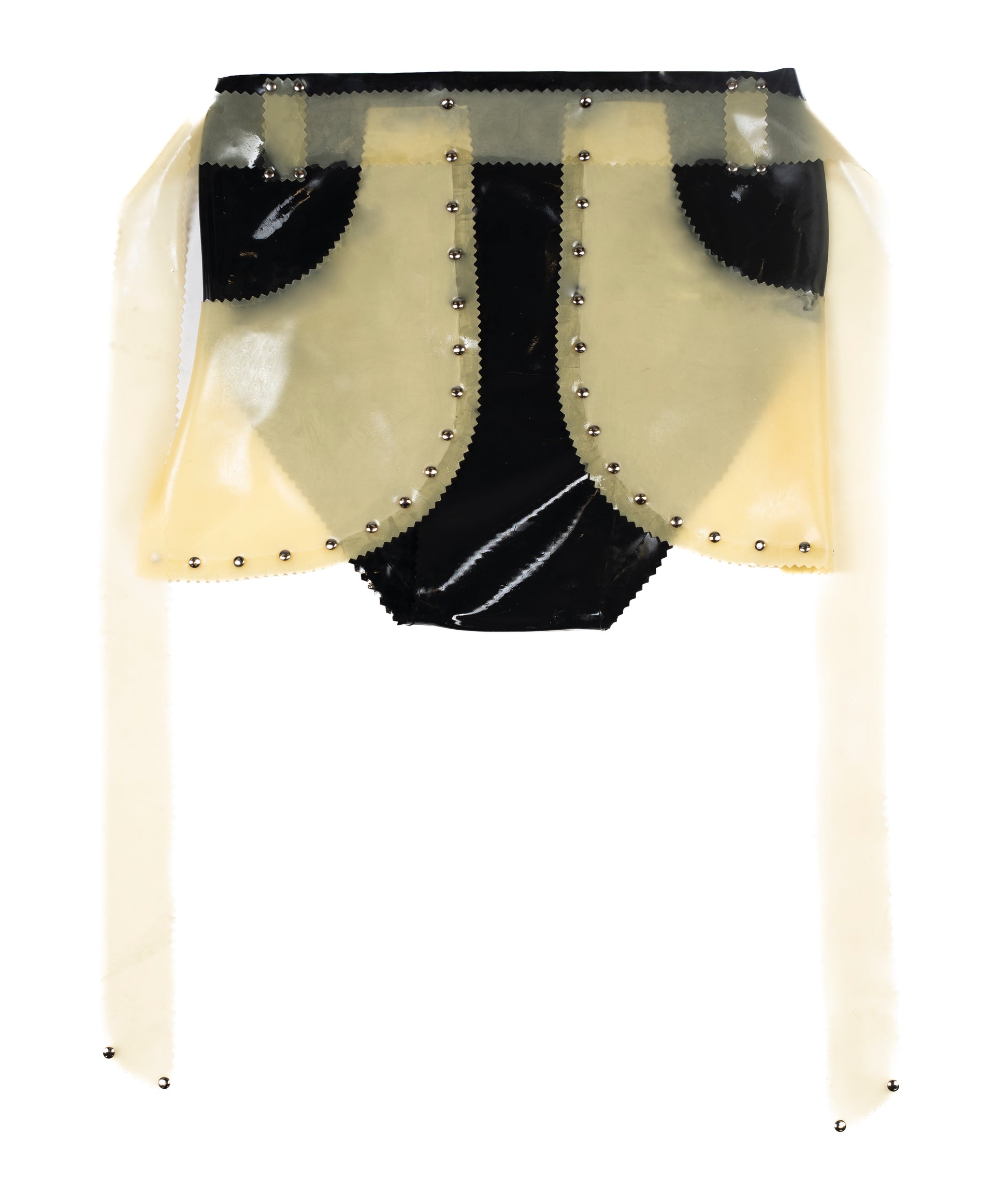 High-gloss latex top with a moulded anatomical bust and pierced nipple detailing. Cargo shorts feature exposed translucent pockets and metal rivets.