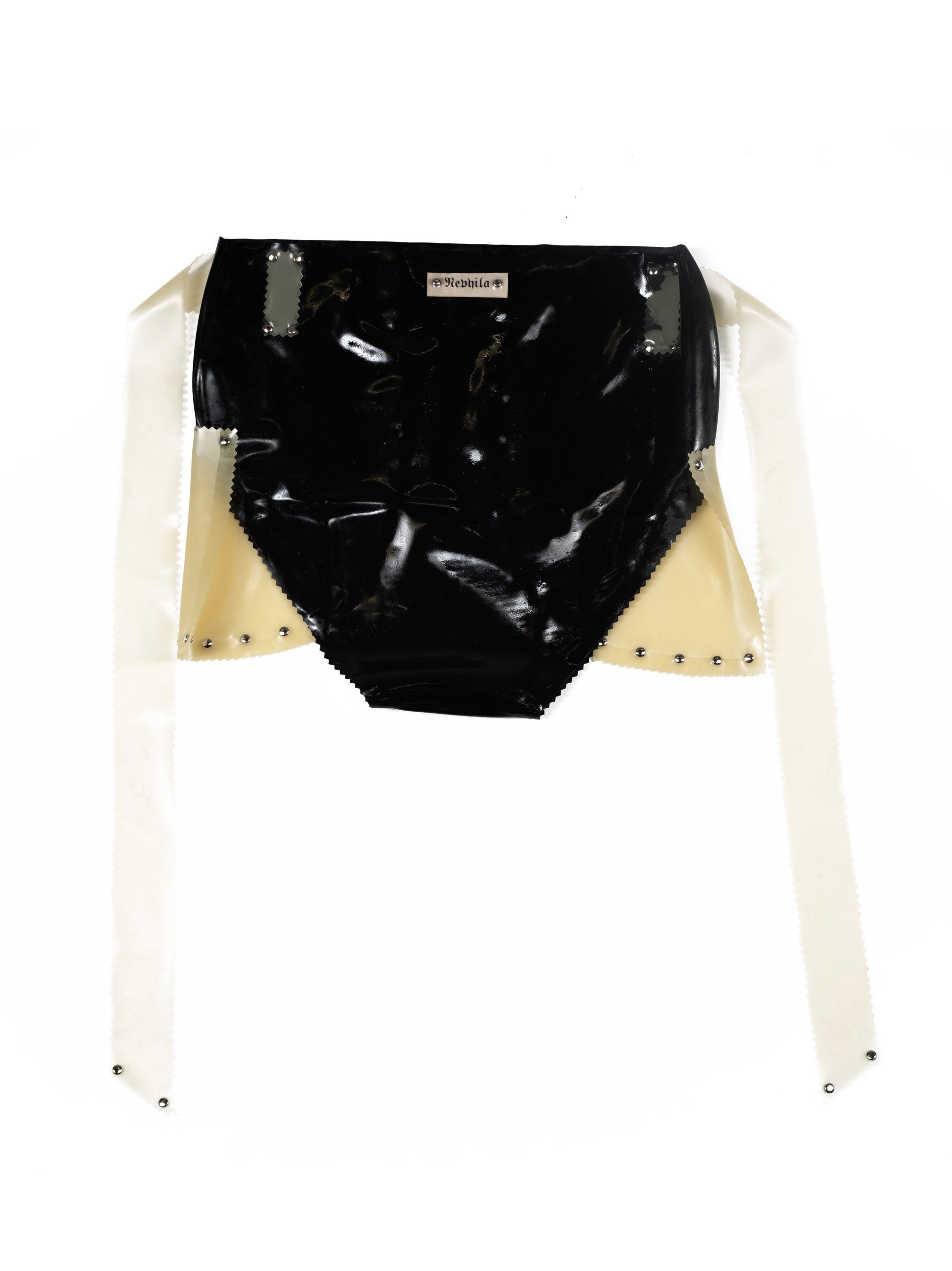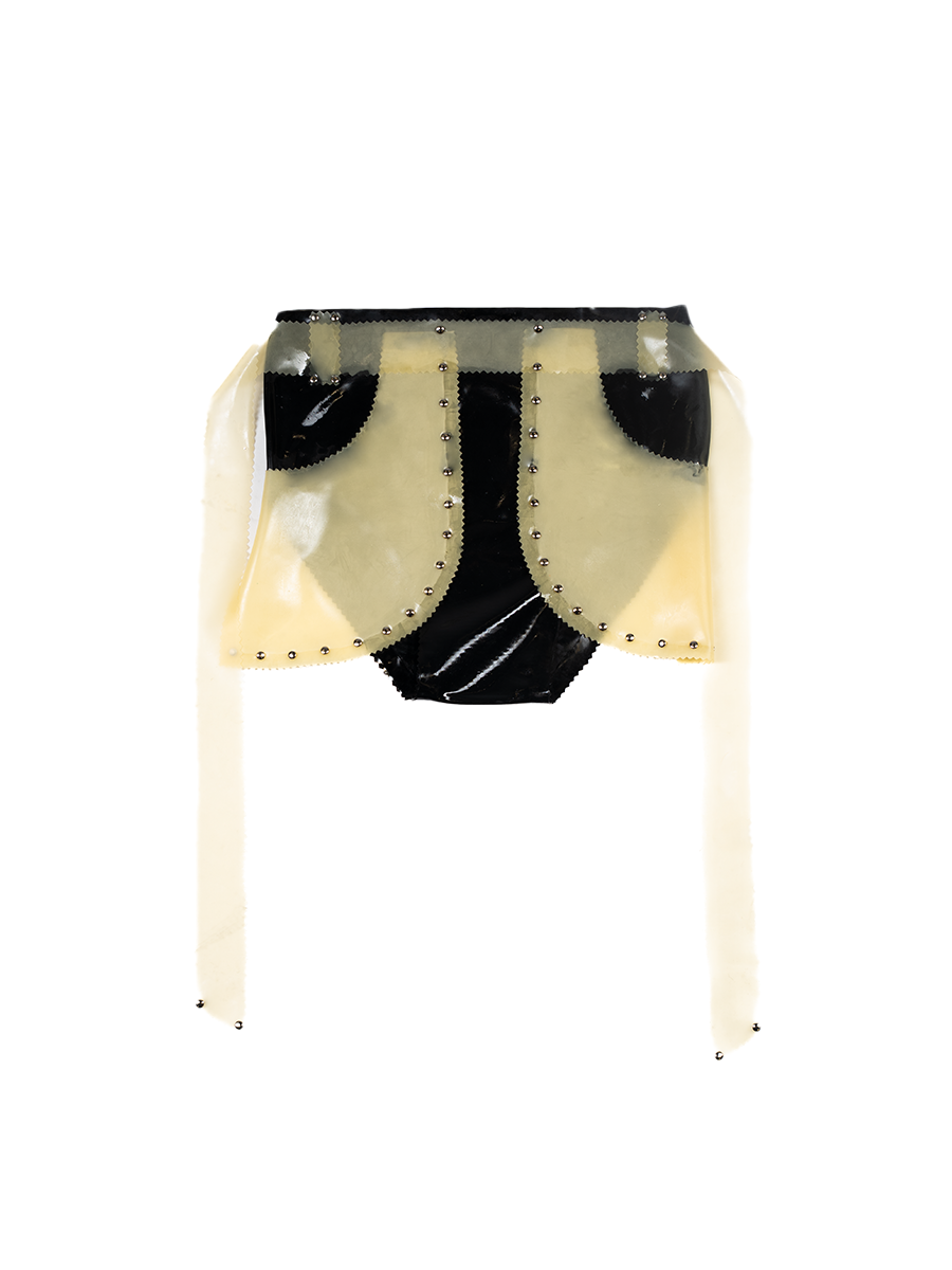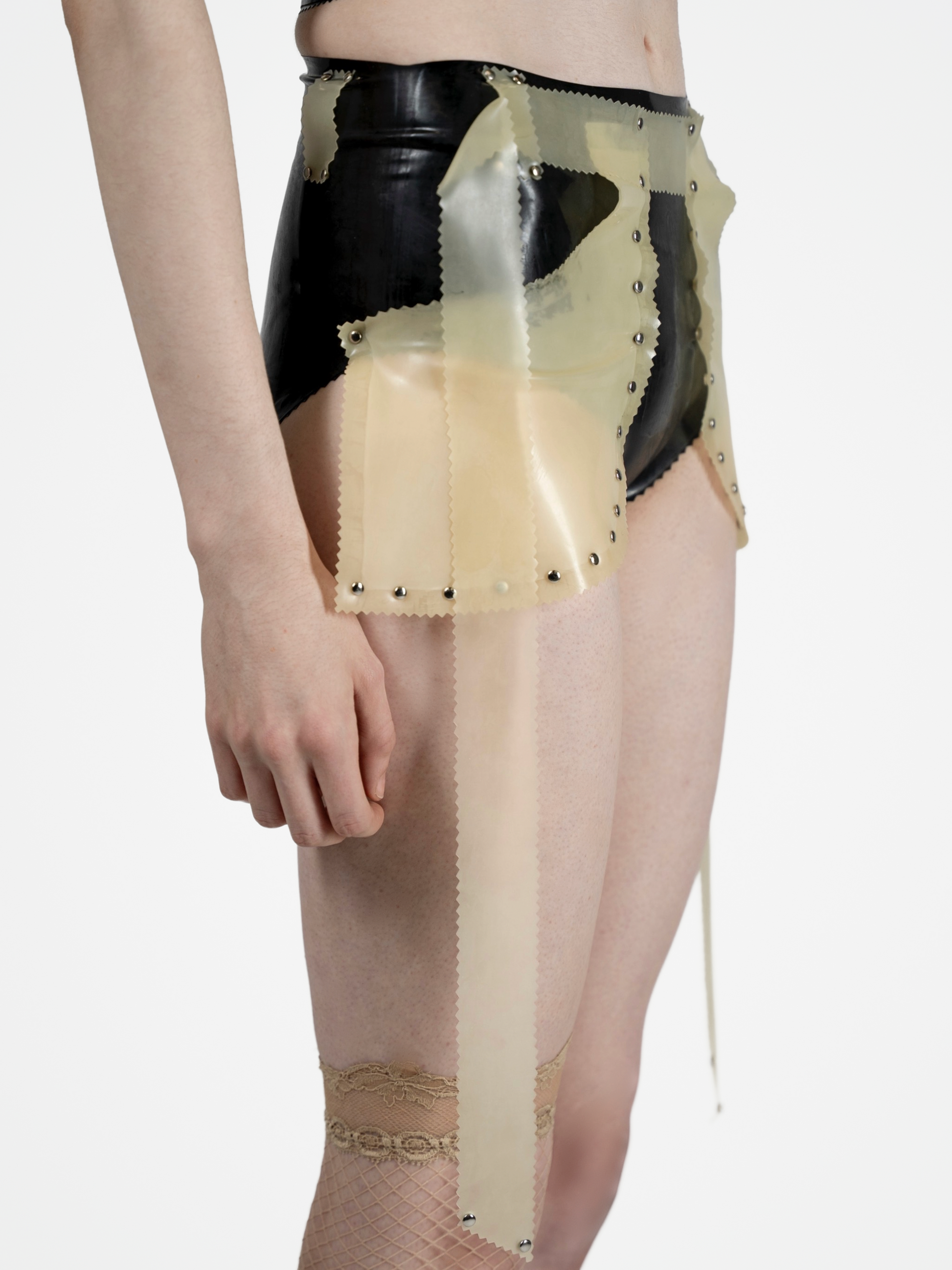 Jet black latex cargo shorts with exposed, translucent latex pocket structure and metal rivet detailing. Belt loops and seams are hand-set and reinforced. Each piece is handcrafted in our London studio.