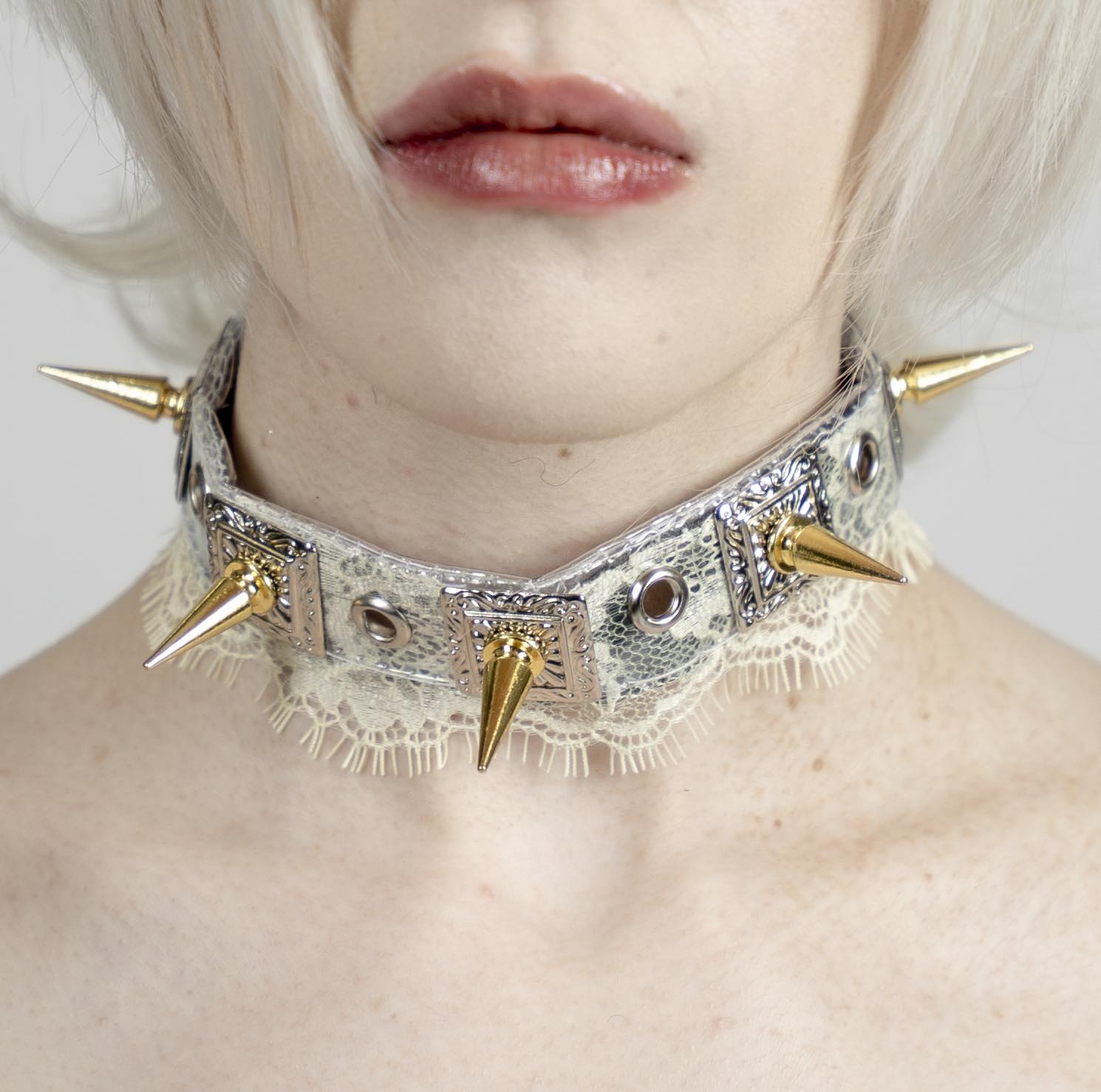 Gold spike choker featuring lace and velvet preserved through the Textile Suspension Method. The embedded fabric creates an archival effect beneath the gloss PVC layer. Finished with exposed scalloped lace hem and customizable hardware detailing.